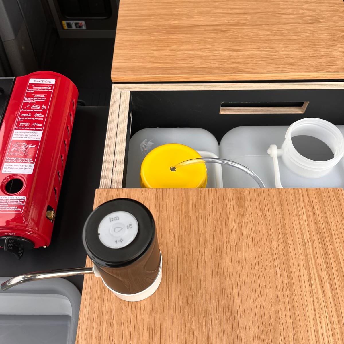 Amplia zona de cocina con acceso cómodo a un fregadero plegable y suministro de agua, ideal para lavarse las manos o los utensilios.