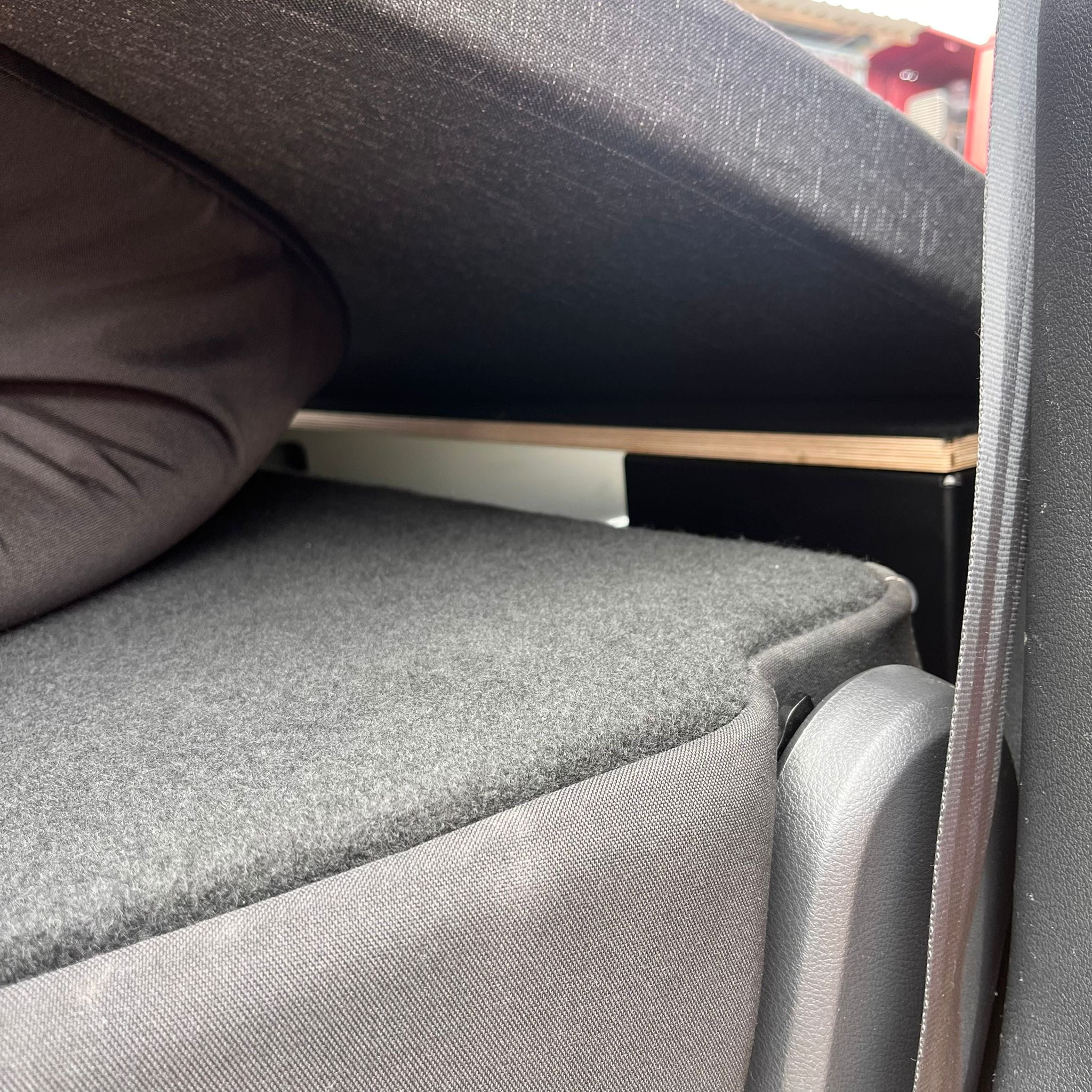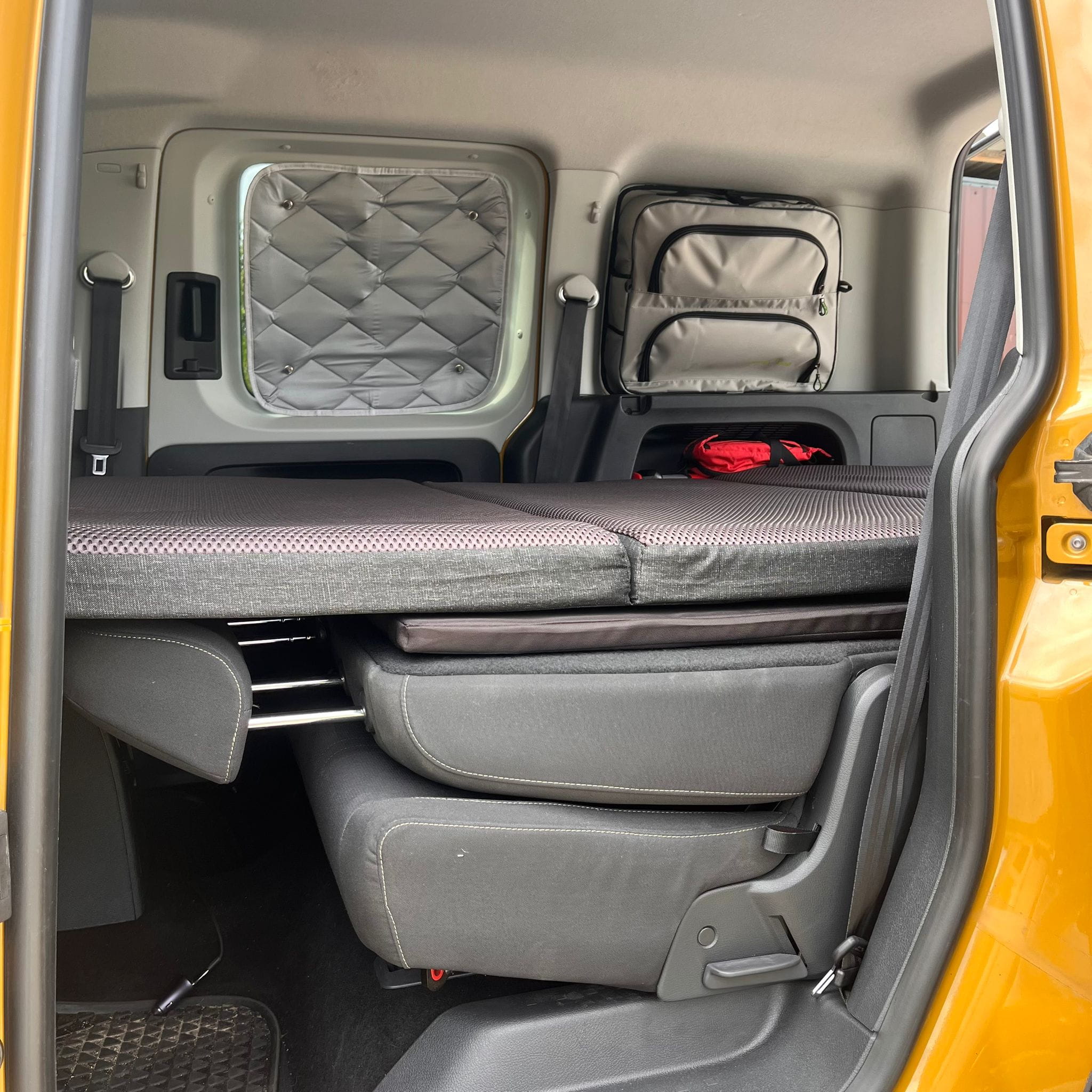 Además, al abatir los asientos, la estantería sirve como extensión de la superficie para dormir, permitiendo pasar la noche en el vehículo con total comodidad.