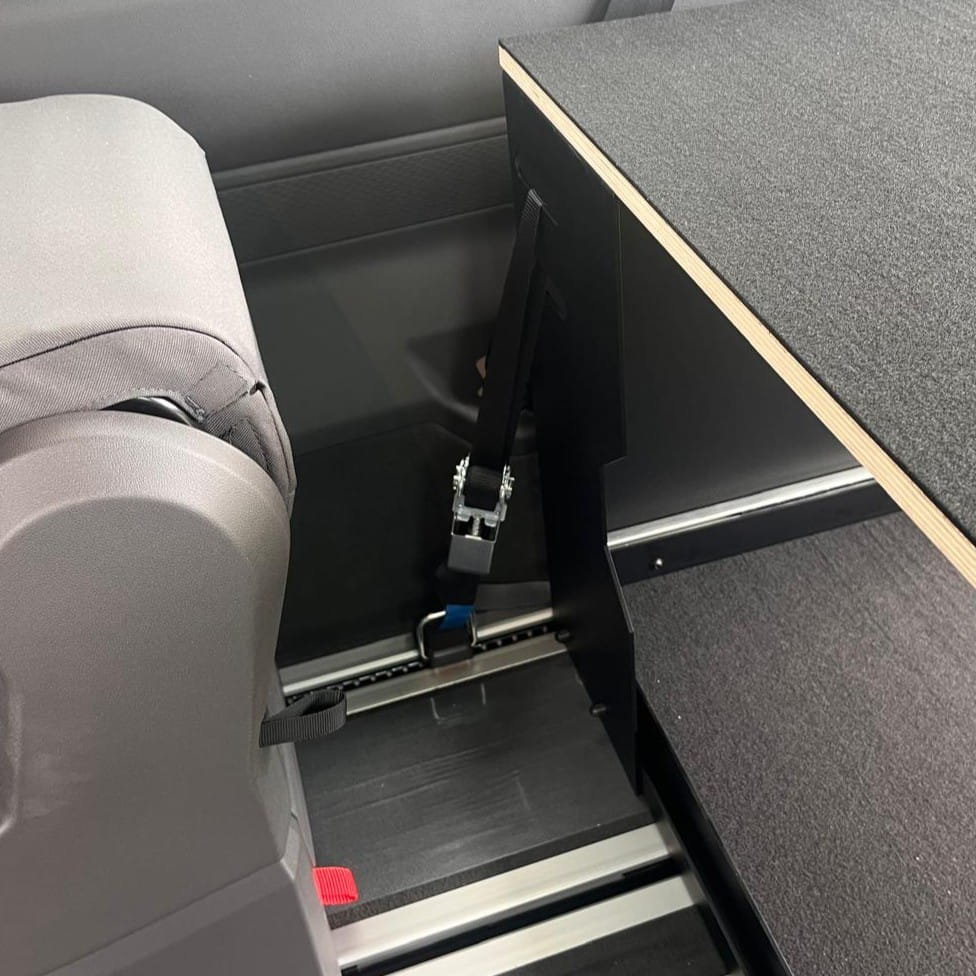 Para los amantes de los viajes y los campervans: al abatir los asientos, la plataforma se convierte en una extensión de la superficie para dormir, proporcionando condiciones cómodas para pernoctar en el vehículo.