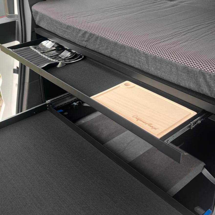 Estante de maletero con cajón, Organizador, Cajón deslizante, Estructura turística, Plataforma, Estante para dormir Nueva California Beach T7, VW T7