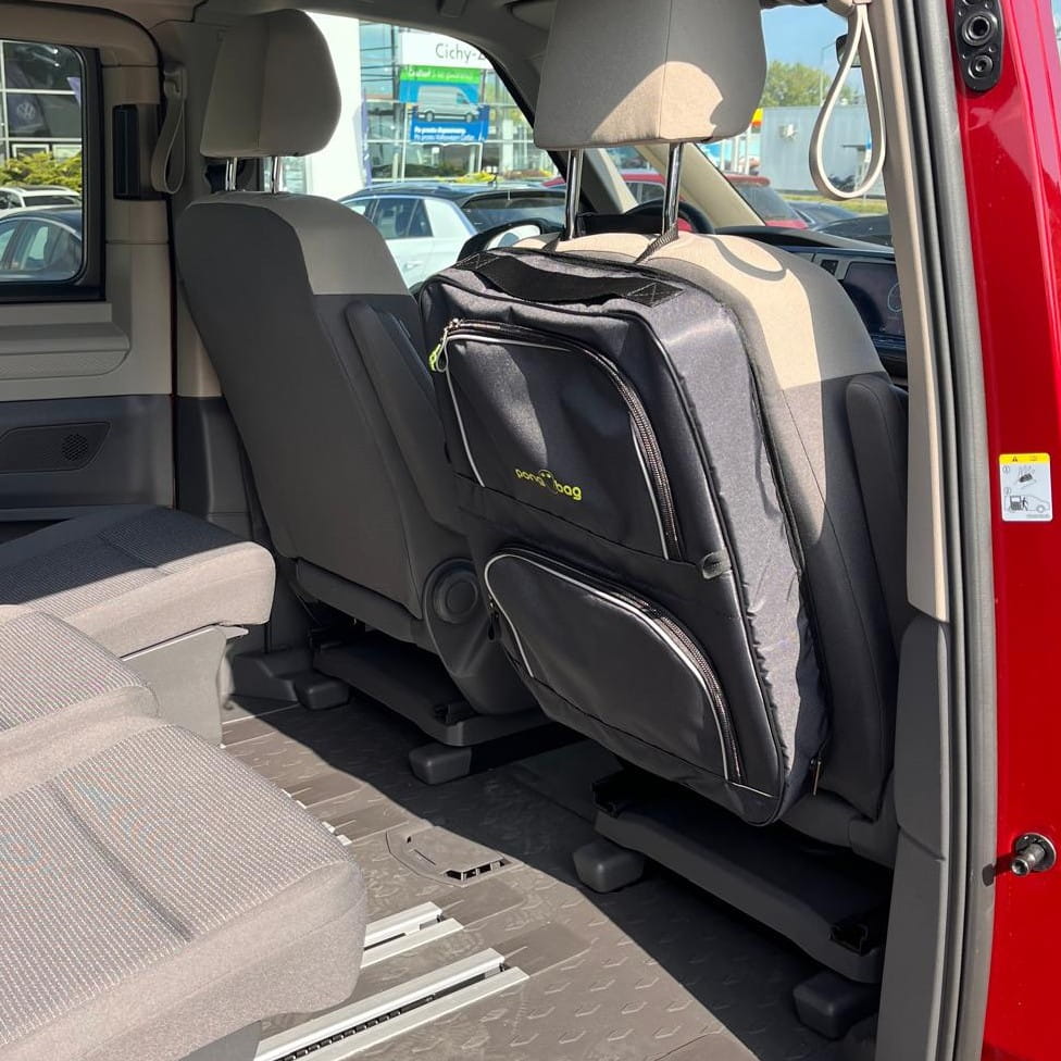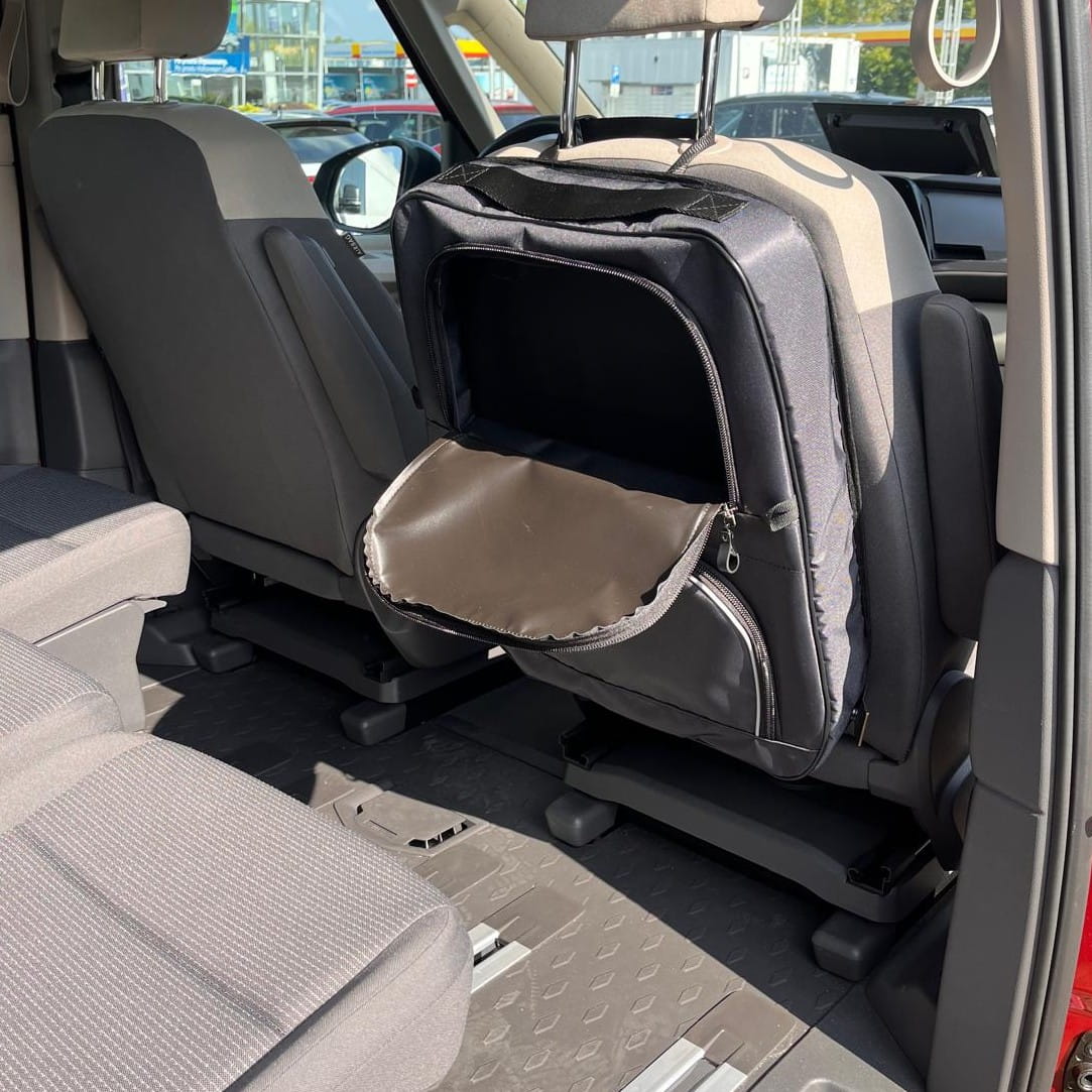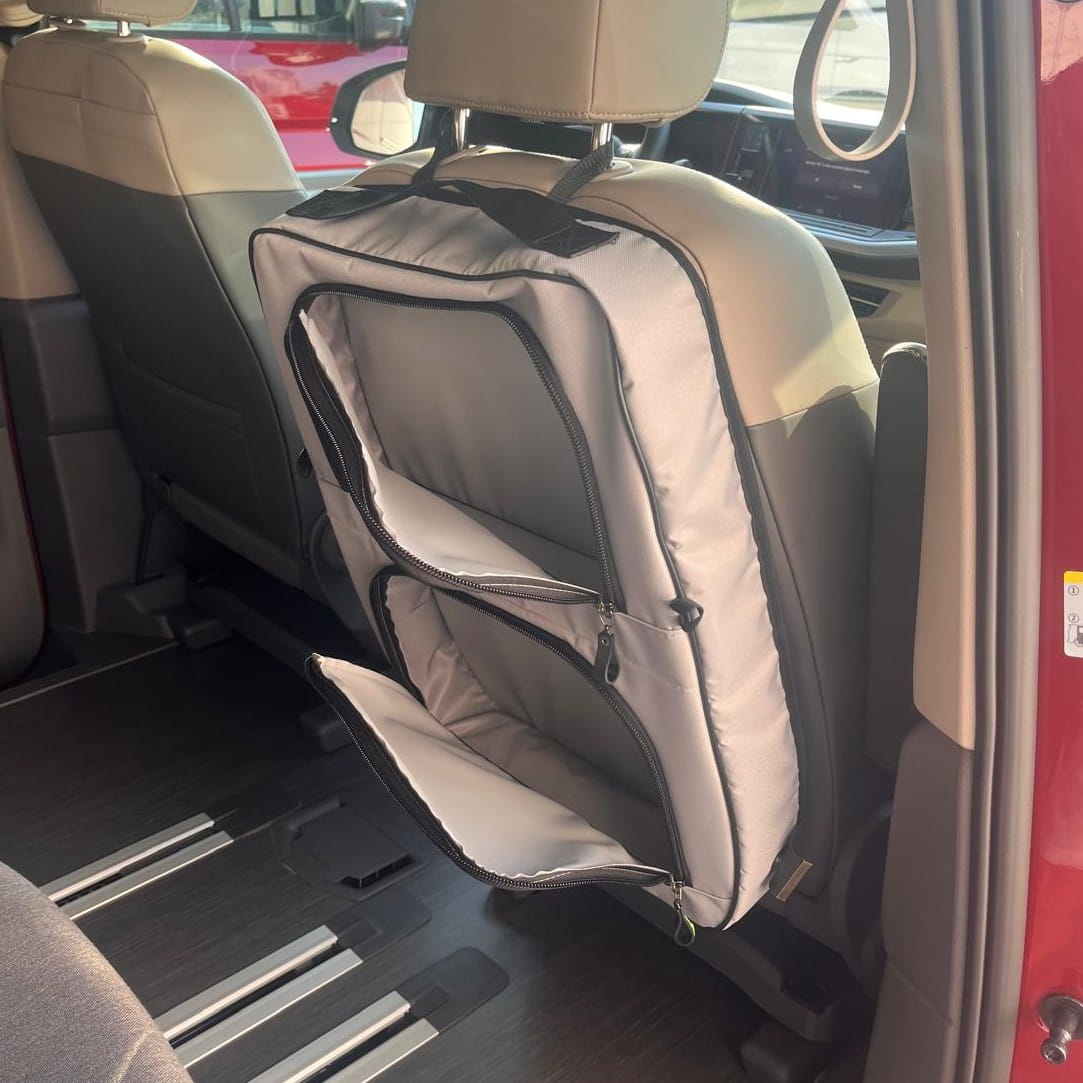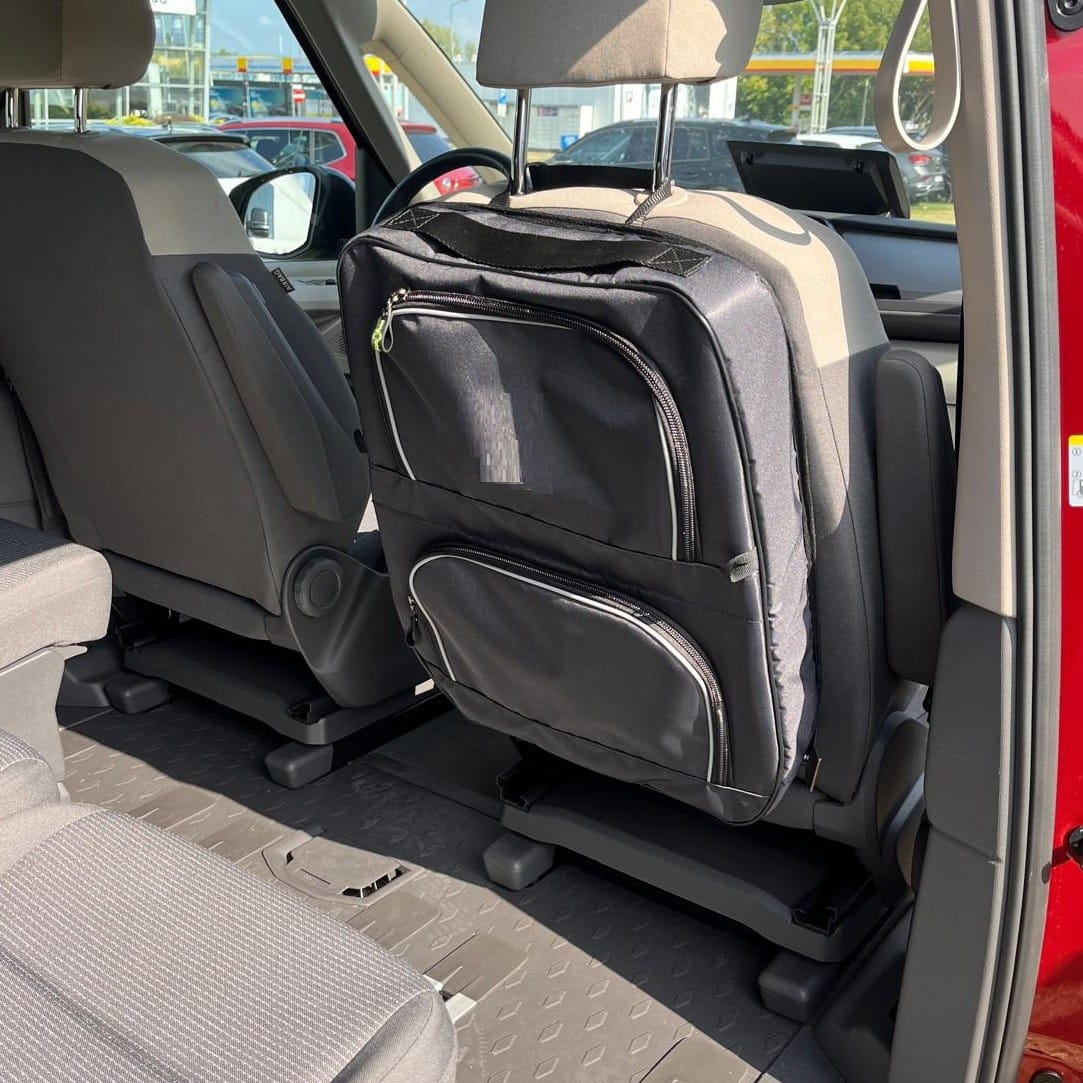 Organizador diseñado para los asientos delanteros de vehículos como Volkswagen T7, T6, T5, Mercedes Clase V, VW Caddy, Peugeot Rifter, Toyota Proace, VW Multivan, Renault Trafic y otros.