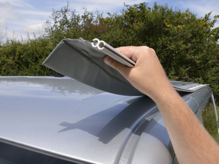Este vestíbulo de autobús compacto y ligero tiene dos arcos de fibra de vidrio, por lo que se puede desplegar muy rápidamente. Trip está equipado con un suelo adjunto con un borde elevado, gracias al cual el agua de lluvia no puede penetrar en el interior. Este borde elevado se puede desplegar en la puerta para evitar tropiezos. La puerta también dispone de una mosquitera para una ventilación adicional. Gracias a ello se puede ventilar el vestíbulo sin exponerse a plagas. La trampilla de conexión excepcionalmente profunda, de nada menos que 90 cm de ancho, tiene una entrada en el lado izquierdo, de modo que se puede subir y bajar rápidamente del autobús sin tener que pasar por el vestíbulo. La trampilla de conexión se puede fijar al autobús de varias maneras.