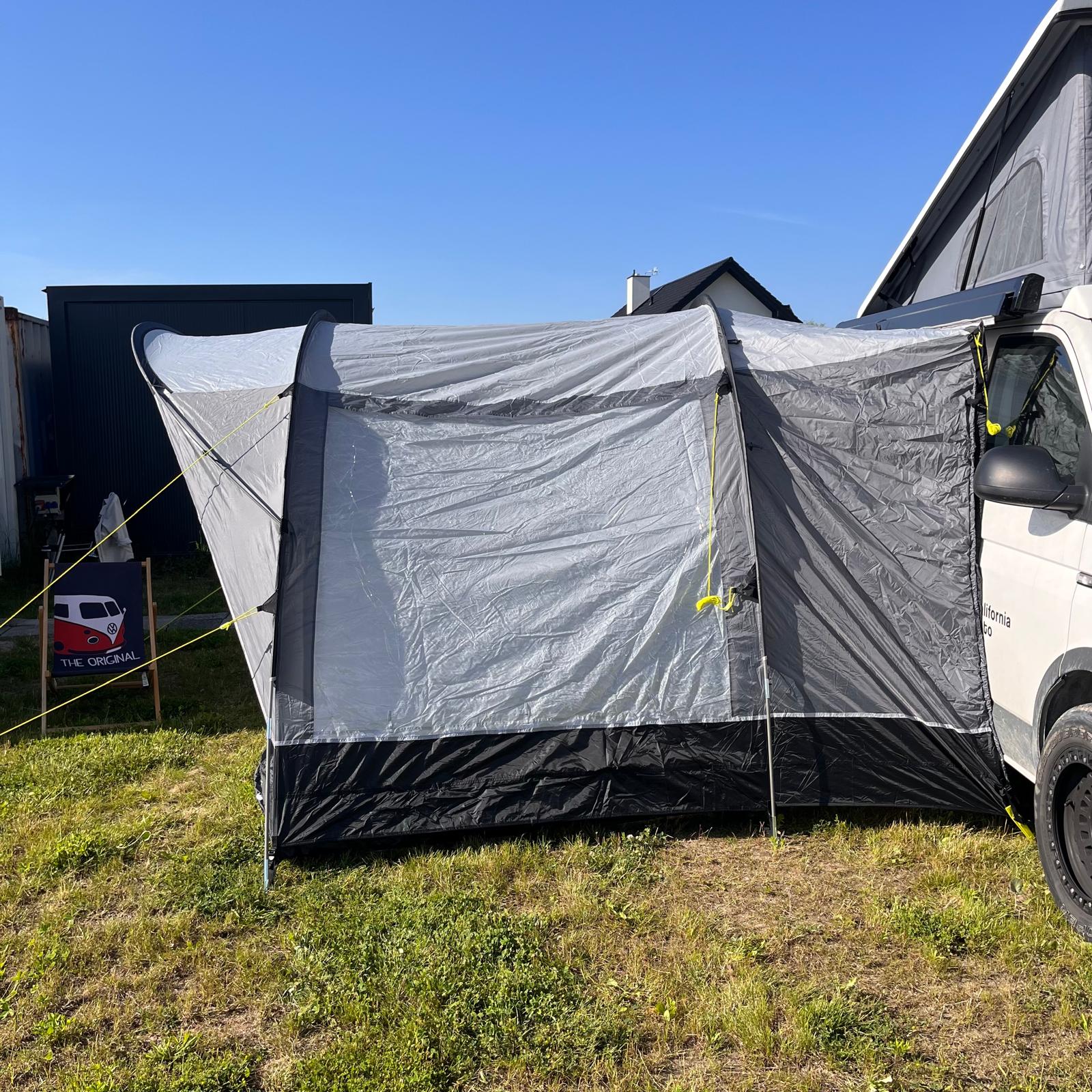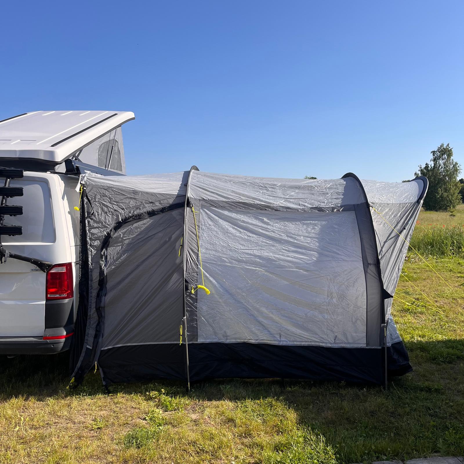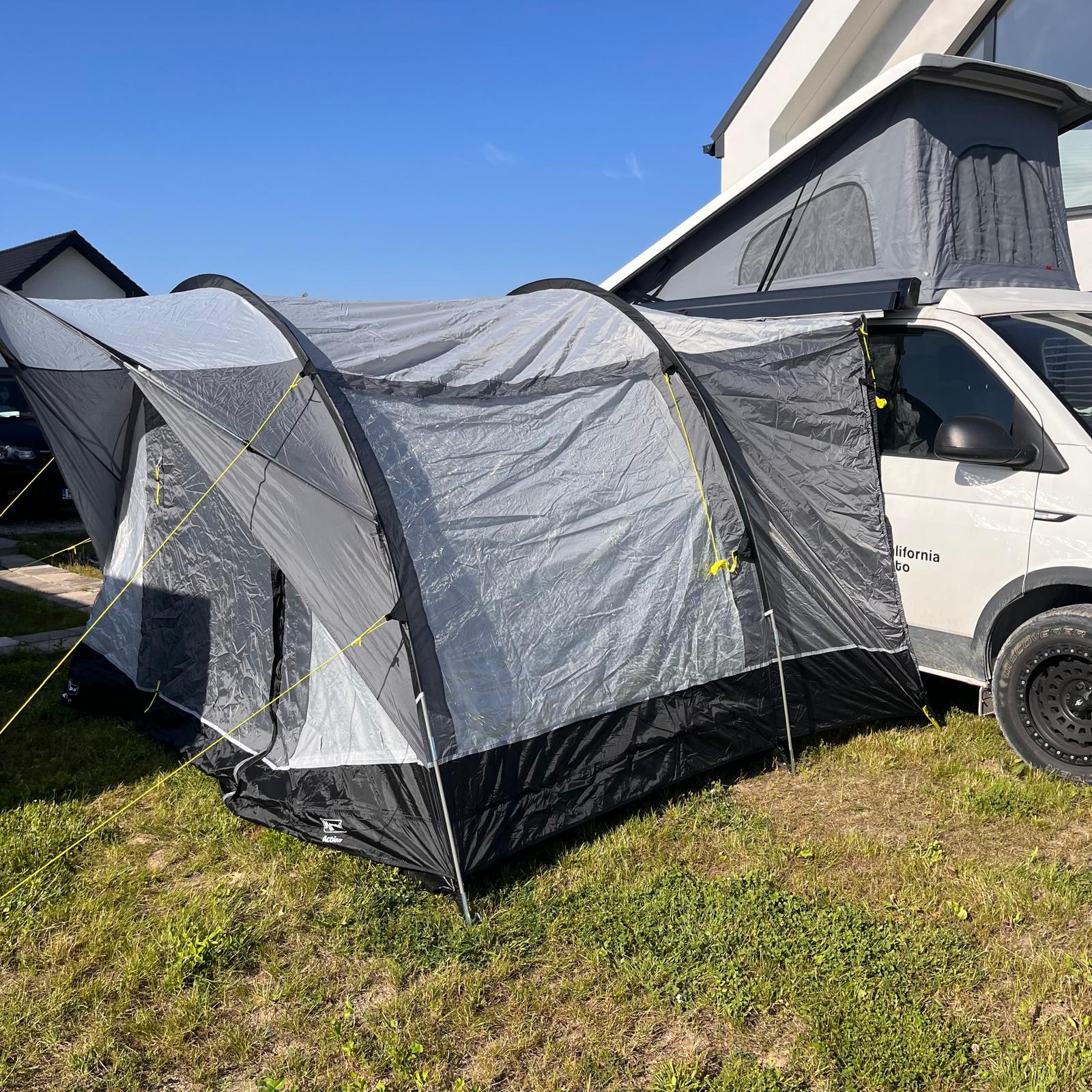 Nuestra tienda lateral es un vestíbulo para autobuses compacto y ligero, que se puede montar rápidamente gracias a los tubos de fibra de vidrio.