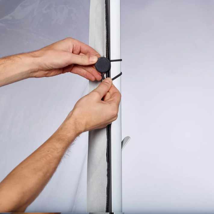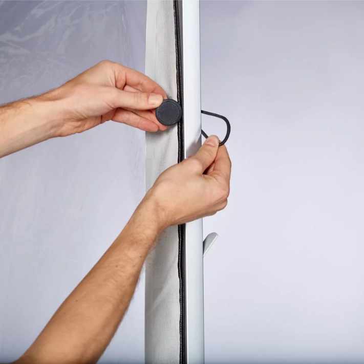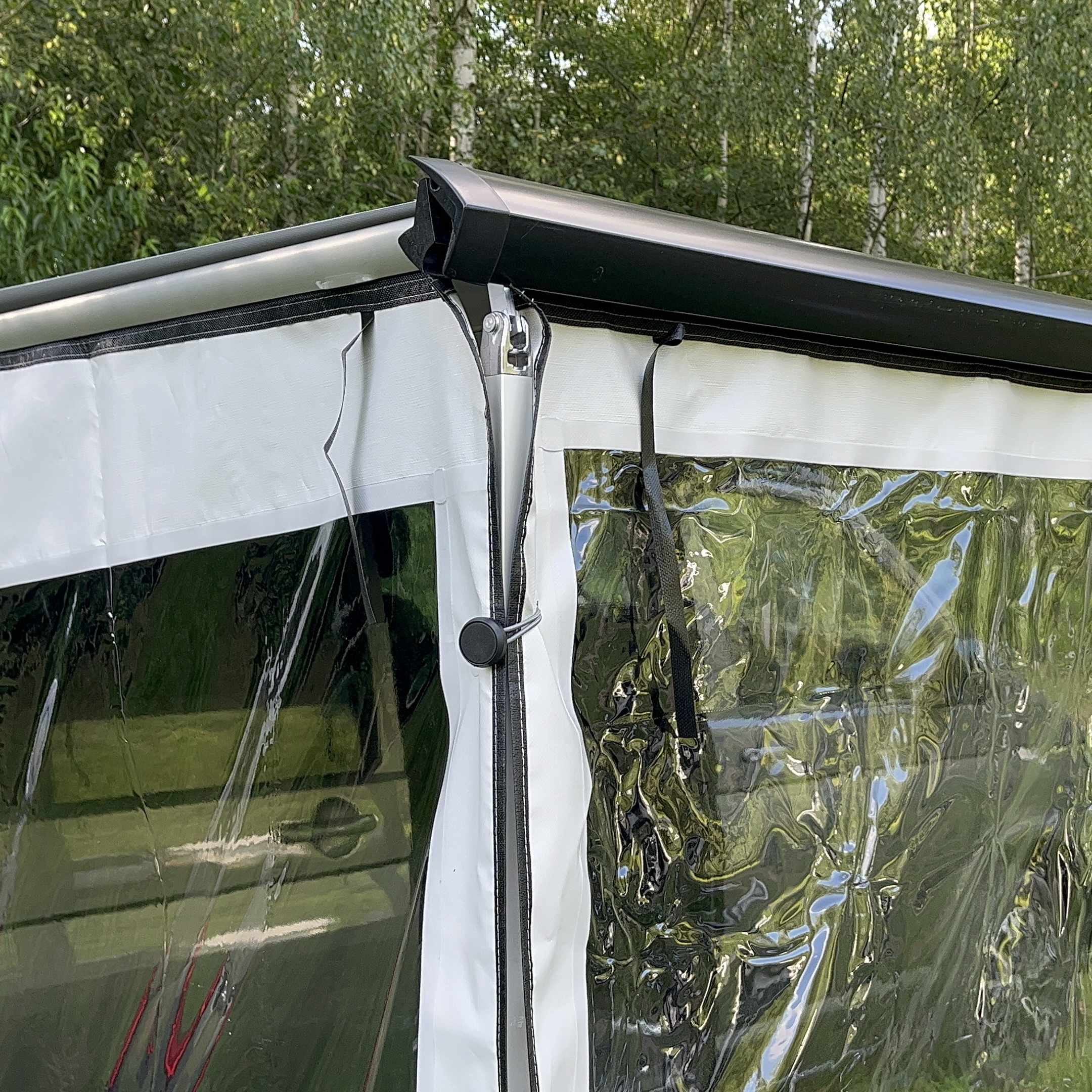 Los paneles están hechos de PVC duradero y tienen ventanas integradas que permiten la entrada de la luz del día, al mismo tiempo que protege contra condiciones climáticas desfavorables. Las paredes laterales se fijan con la barra tensora suministrada, mientras que las paredes frontales se deslizan fácilmente en el riel del toldo. Una vez instalados, todos los paneles se pueden conectar firmemente utilizando las bandas de goma suministradas, creando una estructura firme y estable.