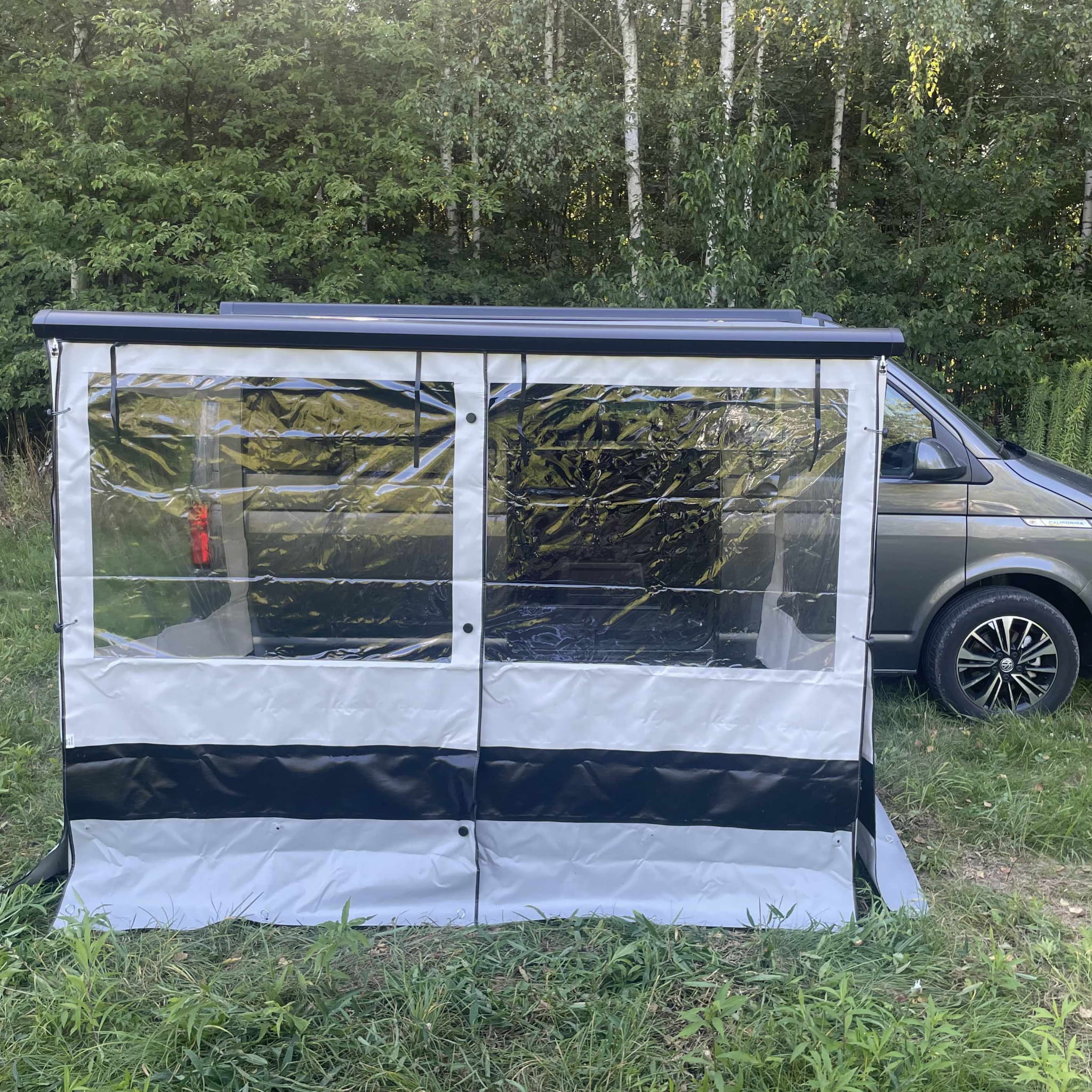 Se trata de un juego completo de paredes laterales y frontales destinado a toldos montados en furgonetas Volkswagen y monovolúmenes PSA. Este conjunto proporciona protección total contra la lluvia y el viento, al tiempo que ofrece privacidad adicional al acampar.