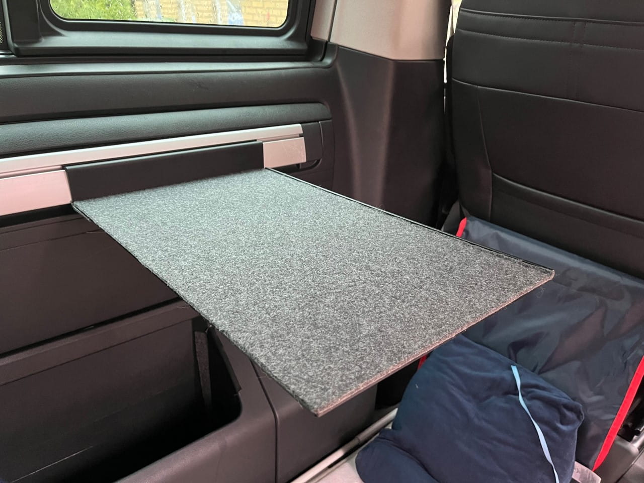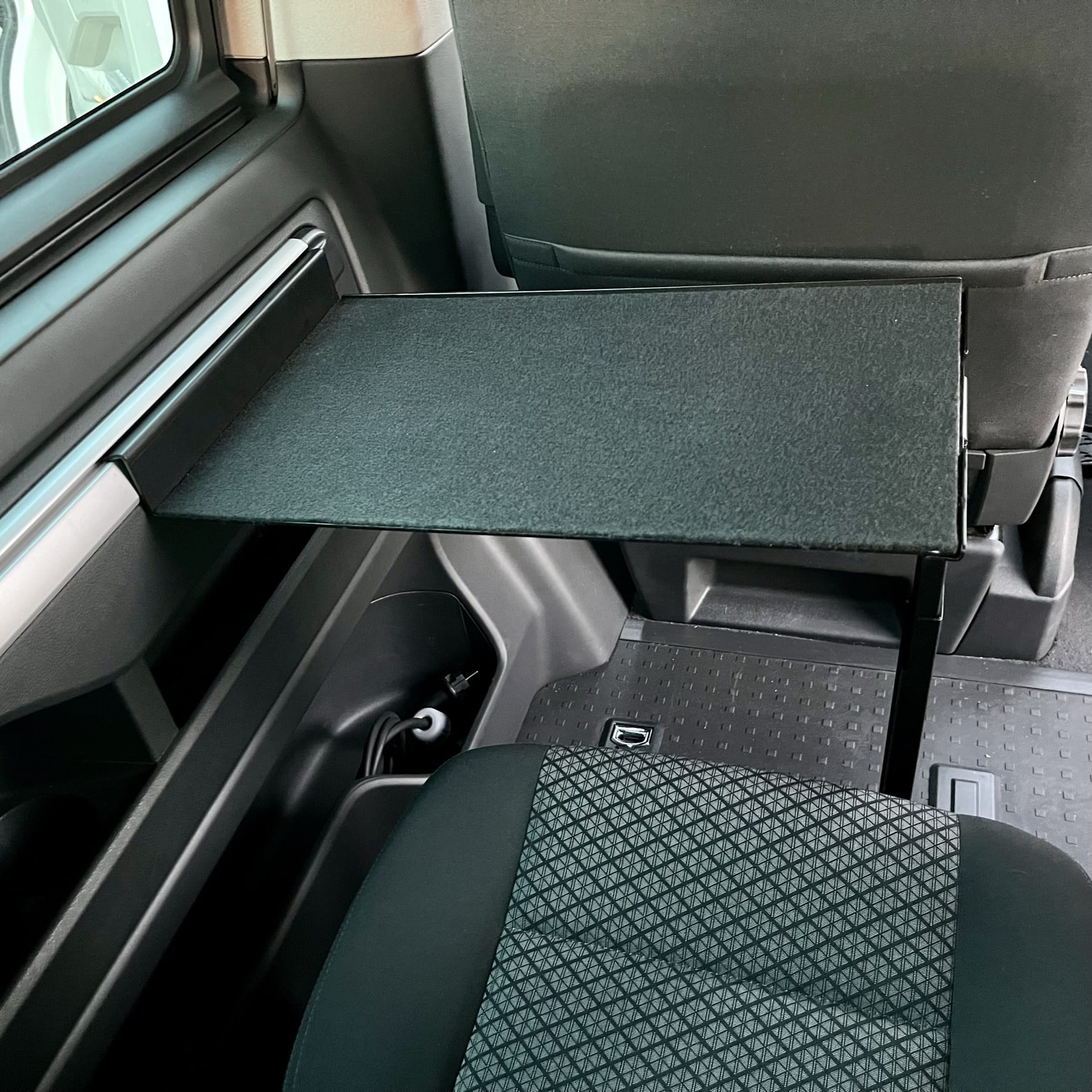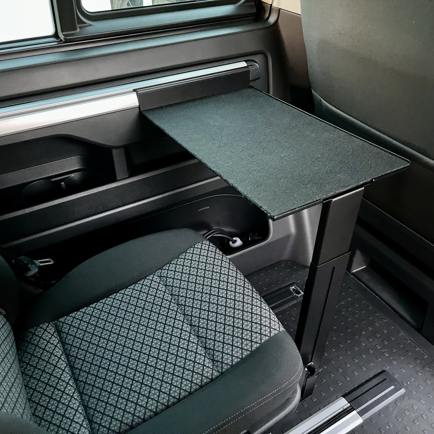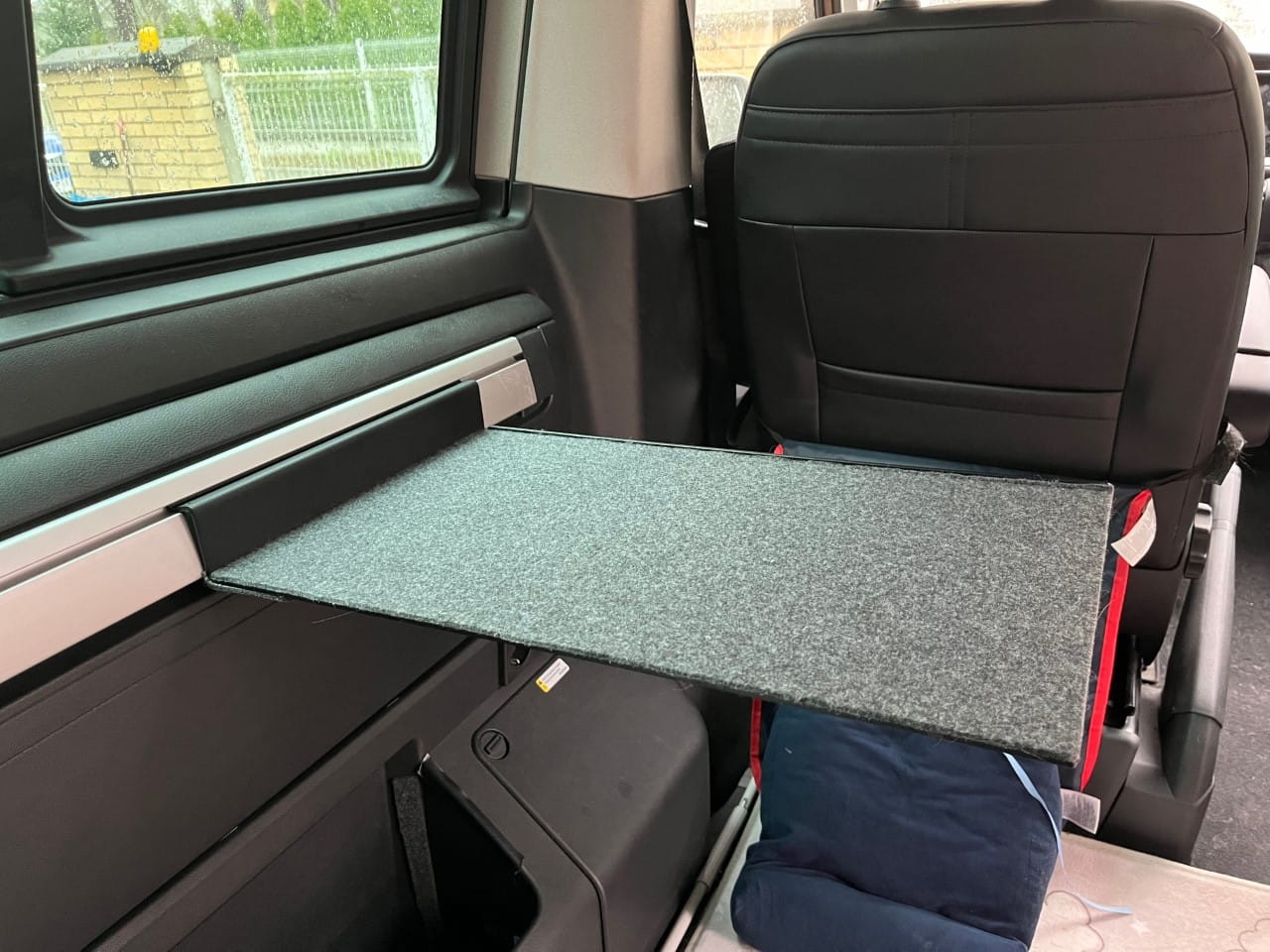Nuestra mesa adicional le permite trabajar frente al ordenador sin tener que desplegar la mesa auxiliar situada en la puerta corredera. La instalación en la barandilla lateral también permite utilizar la estantería de camping cuando el sofá está desplegado: es una plataforma ideal para un ordenador portátil durante una noche de cine.