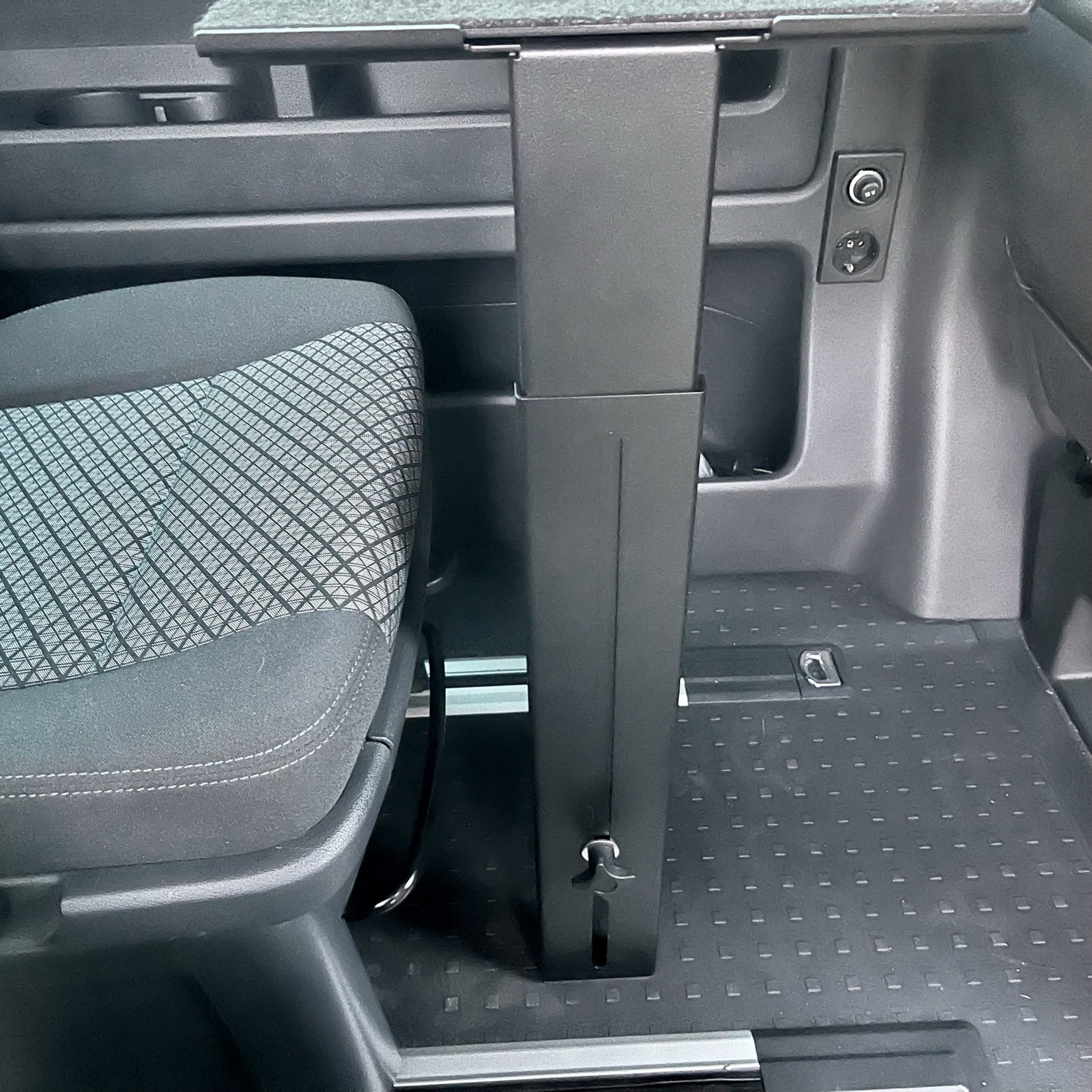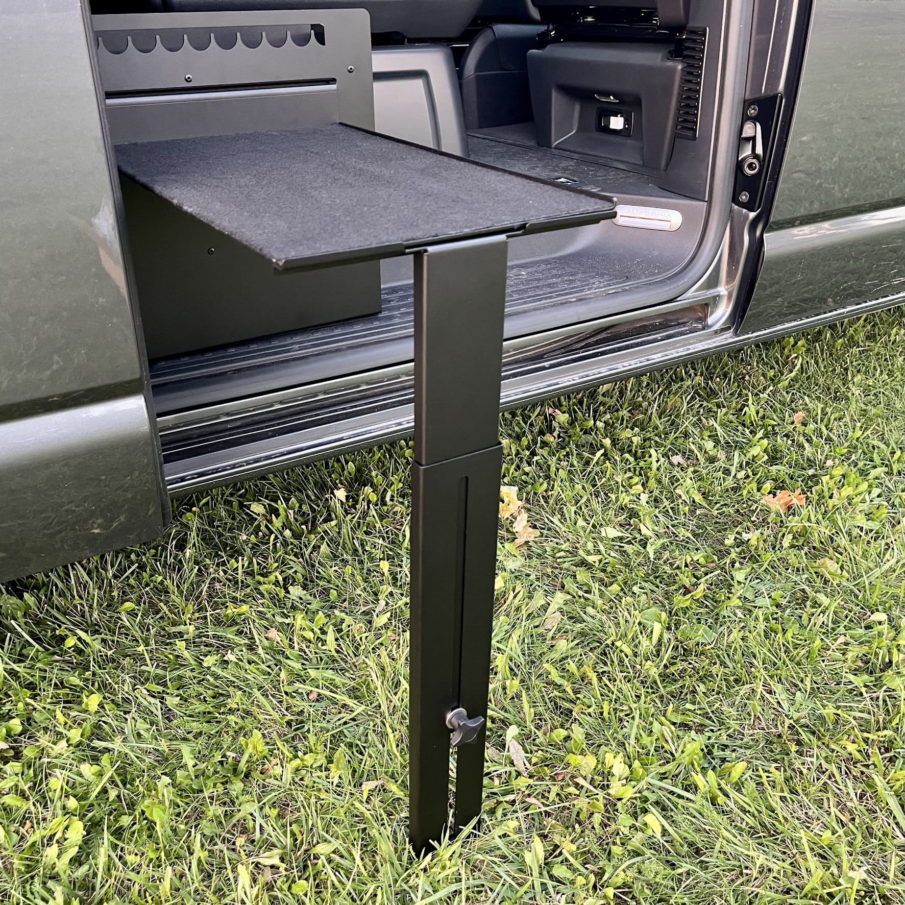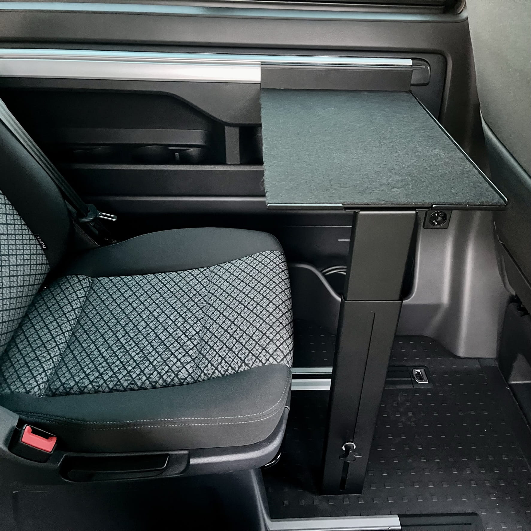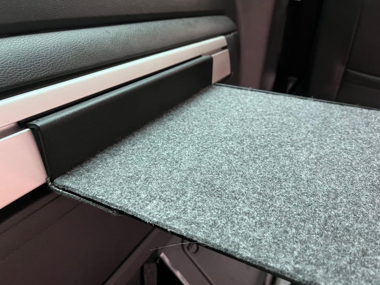 Nuestra mesa adicional le permite trabajar frente al ordenador sin tener que desplegar la mesa auxiliar situada en la puerta corredera. La instalación en la barandilla lateral también permite utilizar la estantería de camping cuando el sofá está desplegado: es una plataforma ideal para un ordenador portátil durante una noche de cine.
